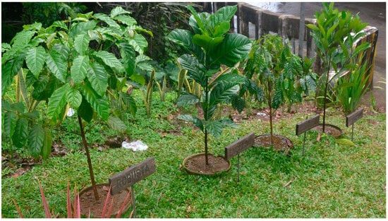 - Cao, E.P.; Constantino-Santos, D.M.; Ramos, L.A.P.; Santos, B.S.; Quilang, J.P.; Mojica, R.M. Molecular and morphological differentiation among Coffea (Rubiaceae) varieties grown in the farms of Cavite Province, Philippines. Philipp. Sci. Lett. 2014, 7, 387–397. Available online: https://scienggj.org/2014/PSL%202014-vol07-no02-p387-397%20Cao.pdf (accessed on 30 June 2023).
