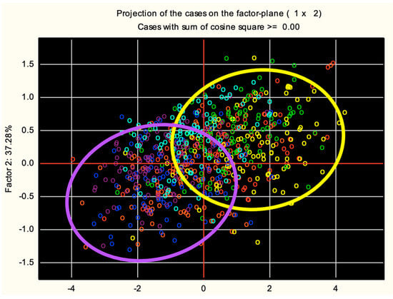 PCA on coffee bean morphometrics of C. liberica grown in six different farms in the Philippines. The purple and yellow circles are drawn around the most different clusters. These two ‘varieties’ are more different from each other than from others.