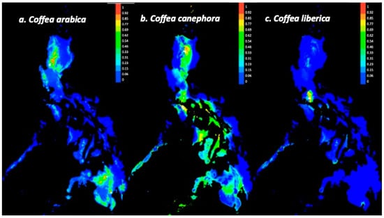 MaxEnt model outputs for (a) C. arabica; (b) C. canephora; and (c) C. liberica. The limited distribution in C. liberica is shown.