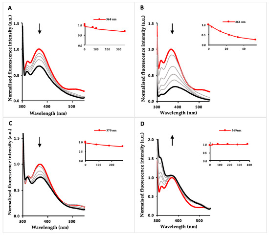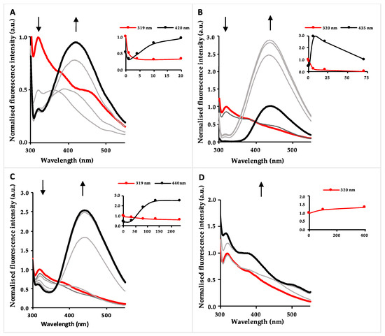 However, significant changes could be seen in the fluorescence spectrum of system 3. In the spectrofluorimetric titrations with Cu2+ in acetonitrile, a strong decrease of the fluorescence intensity was observed for compound 3, with only 1.0 equivalent being necessary to quench 50% of the initial fluorescence. Figure 1 shows the spectrofluorimetric titrations of asparagine 3 with Cu2+, where it was revealed that upon addition of increasing amounts of the cation, the band at 319 nm decreased drastically, accompanied by the appearance of a red-shifted band at 420 nm with growing fluorescence intensity that achieved a plateau upon addition of about 20 equivalents of Cu2+ (Figure 1A). There was a similar behaviour in the spectrofluorimetric titrations with Fe2+ and Fe3+; a decrease of the fluorescence intensity was observed at 320 nm, accompanied by an increase in the fluorescence intensity at 435 and 440 nm, respectively. However, the titration with Fe3+ gave an irregular trend of variation (Figure 1B) whereby, in comparison to Cu2+, it was necessary to add a larger amount of Fe2+ (120 equivalents) to achieve a fluorescence plateau at the new red-shifted band, with higher fluorescence intensity (Figure 1C). In the spectrofluorimetric titrations with Zn2+ in acetonitrile, no significant changes were observed with the addition of increasing amounts of this cation, and therefore the heterocyclic asparagine does not behave like a chemosensor for Zn2+ (Figure 1D). From the results obtained, it can be proposed that the synthesized asparagine is a chemosensor for Cu2+ in acetonitrile with high sensitivity.