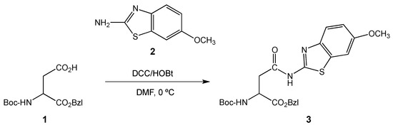 Asparagine derivative 3 was obtained from the corresponding N-tert-butyloxycarbonyl asparagine benzyl ester precursor 1 and 2-amino-6-methoxybenzothiazole 2, by a DCC/HOBt mediated coupling in excellent yield of 91% (Scheme 1). This synthesis was carried out as reported previously by us [3] and the structure of the synthesized compound was confirmed by 1H and 13C NMR spectroscopy.