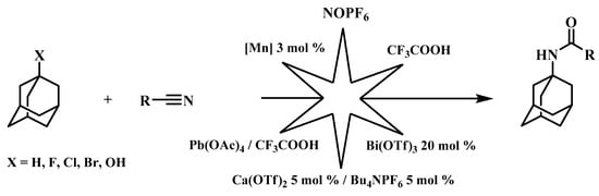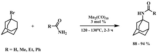 - Khusnutdinov, R.I.; Shchadneva, N.A.; Khisamova, L.F. Synthesis of N-(adamantan-1-yl)amides by reaction of carboxylic acid amides with 1-bromo(chloro)adamantane catalyzed by manganese compounds. Russ. J. Org. Chem. 2015, 51, 476–479. [Google Scholar] [CrossRef]