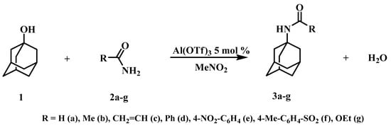 - Pat. RU 2455280 C1, Sposobpolucheniya N-(1-adamantyl)acetamida/U.M. Dzhemilev (RU), R.I. Khusutdinov (RU), N.A. Shchadneva (RU), J.J. Majakova (RU), T.M. Oshnjakova (RU). Available online: http://www.freepatent.ru/images/patents/4/2455280/patent-2455280.pdf (accessed on 1 November 2018).
