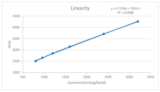 Linearity: Concentrations from 800–3200 ng/band having same volume (8 µL) of NTB were applied in triplicate on HPTLC plate. A graph of obtained peak areas versus the corresponding concentration were plotted and evaluated using linear regression analysis.
