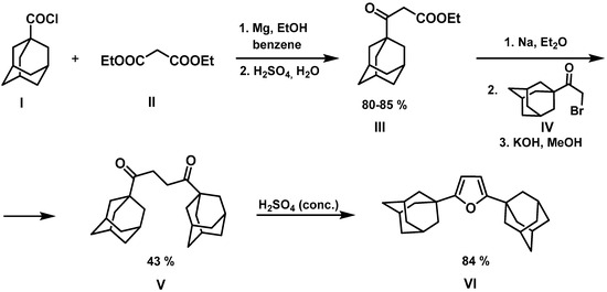 Among the first examples of preparation of furans containing the 1-adamantyl moiety wasthe method where 2,5-di(1-adamantyl)furan was prepared using 1-adamantoyl chloride and malonic ester as the starting compounds [1] (Figure 1).