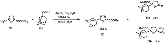 Amethod for preparation of adamantylated furans was described thatincludes the radical adamantylation of methyl 5-nitrofuran-2-carboxylic acid VII or 5-nitrofurfural. The adamantyl radical in this method isgenerated by the Ag(I)-catalyzed oxidative decarboxylation of 1-adamantanecarboxylic acid VIII [2] (Figure 2).
