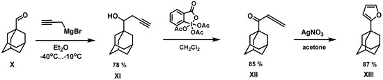 Initially, the reaction of 1-adamantanecarbaldehyde and propargyl magnesium bromide affords the corresponding homopropargyl alcohol XI, which is oxidized by the Dess–Martin periodinane into allenyl ketone XII. Its subsequent heterocyclization on exposure to silver nitrate results in the target 1-adamantylfuran XIII in atotal yield of 58% (based on three steps) [3].