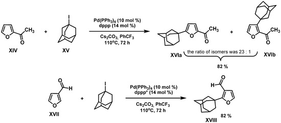 The method for 1-adamantylation of furans ring-substituted with electron-withdrawing groups (2-acetylfuran XIV, furan-3-carboxaldehyde XVII) using 1-iodoadamantane XV in the presence of 10 mol% tetrakis(triphenylphosphine)palladium(0), 14 mol% 1,3-bis(diphenylphosphino)propane (dppp), and 200 mol% cesium carbonate in trifluorotoluene is known [4] (Figure 4).