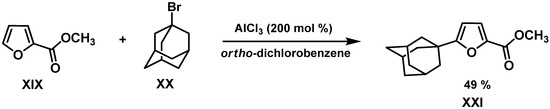 Adamantylation using 1-bromoadamantane in the presence of Lewis acid was used in the patent application: methyl furan-2-carboxylate XIX was treated with 1-bromoadamantane XX in ortho-dichlorobenzene in the presence of 200 mol% aluminum chloride. The yield of the target product XXI was 49% [5] (Figure 5).
