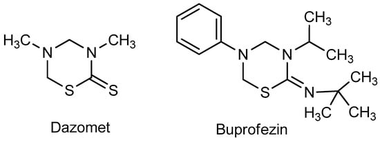 The Mannich reaction is an effective tool to build C–C–N and X–C–N bonds (where X = N, O, S, Se, P, etc.), and therefore it is often used in the synthesis of a wide variety of heterocyclic compounds (for the reviews on the various modifications of the Mannich reaction, see [1,2,3,4,5,6,7,8,9]. 1,3,5-Thiadiazines belong to an important class of heterocyclic compounds. The synthesis of 1,3,5-thiadiazines is successfully realized on the basis of Mannich-type aminomethylation [10,11,12,13]. 1,3,5-Thiadiazines are also of interest due a wide range of biological activity and practically important properties [12,14,15]; among the most important representatives of this class, the fungicide Dazomet and the highly effective insecticide Buprofezin, are worth mentioning (Figure 1).