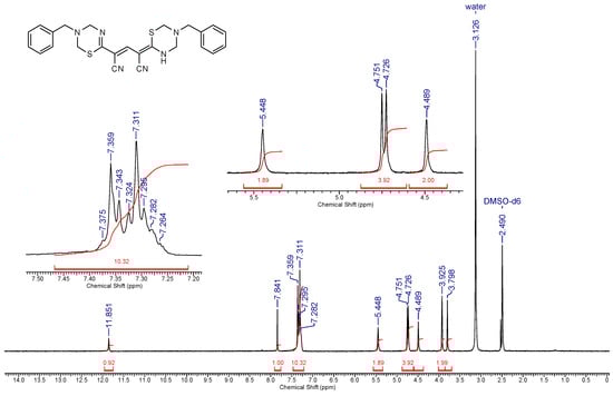 1H NMR spectrum (400 MHz, DMSO-d6) of 4-(5-benzyl-1,3,5-thiadiazin-2-ylidene)-2- (3-benzyl-3,4-dihydro-2H-1, 3,5-thiadiazin-6-yl)pent-2-endinitrile 4a.
