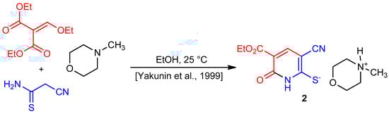 Further investigation of the reaction of cyanothioacetamide with ethoxymethylene malonate in the presence of triethylamine and N-methylmorpholine allowed us to conclude that: (1) in the case of N-methylmorpholine under the conditions described earlier [19]; pentadiethiolates 5 were not isolated; (2) replacement of N-methylmorpholine to triethylamine favors the formation of compound 5 under short-term heating of a mixture; (3) the content of product 5 in the mixture does not exceed 10–15 mol% (according to 1H NMR); (4) analytically pure triethylammonium 3-cyano-5-ethoxycarbonyl-6-oxo-1Н-pyridine-2-thiolate 1 can be prepared by reaction of cyanothioacetamide and ethoxymethylene malonate in acetonic solution at the room temperature; (5) a longer heating neither favors the formation of compound 5, nor leads to an increase in the yields of thiolates 1 or 2, but leads to a noticeable resinification of the reaction mixture, possibly due to further intramolecular cyclizations of compounds 5 or 7, or self-condensation of cyanothioacetamide, which occurs under basic conditions [29,30].
