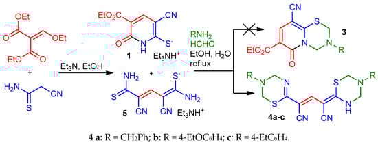 To prepare thiolate 1, cyanothioacetamide was reacted with ethoxymethylene malonate in the presence of a 1.5-fold excess of Et3N while slowly heating the reaction mixture to boiling point. The reaction product was put into reaction with primary amines with an excess of 37% without further purification. The aminomethylation products were precipitated from a boiling solution during the reaction. To our surprise, the IR spectra of the supposed pyrido[2,1-b][1,3,5] thiadiazines 3 revealed the absence of stretching vibration bands of the ester C=O group, while the bands corresponding to the stretching vibrations of the conjugated cyano group (~ 2215–2220 cm−1) and N–H bonds (ν ~ 3350–3400 cm−1) were observed. In the 1H NMR spectra of the synthesized compounds, there are a broadened NH proton singlet (δ 11.86–12.06 ppm), two sets of signals from primary amines, and four non-equivalent signals of the X–CH2–N protons in the expected region (δ 4.5 ... 6.0 ppm), as well as a narrow singlet at δ 7.63–7.85 ppm (Figure 2). Moreover, the characteristic signals of the ethoxycarbonyl group were absent in the NMR spectrum. Analysis of spectral data, the results of elemental analysis, as well as HPLC-MS data allowed us to conclude that the products actually have a structure of 4-(1,3,5-thiadiazin-2-ylidene)-2-(3,4-dihydro-2H-1,3,5-thiadiazin-6-yl)pent-2-endinitriles 4 (Scheme 2). A detailed analysis of the spectral data of the starting thiolate 1 revealed that, unlike the thiolate 2 obtained by a known method [19], the sample we synthesized is actually a mixture of triethylammonium 1,5-diamino-2,4-dicyano-5-thioxopenta-1,3-diene-1-thiolate 5 (minor product) and triethylammonium 3-cyano-5-ethoxycarbonyl-6-oxo-1Н-pyridine-2-thiolate 1 (main product) (Scheme 2).