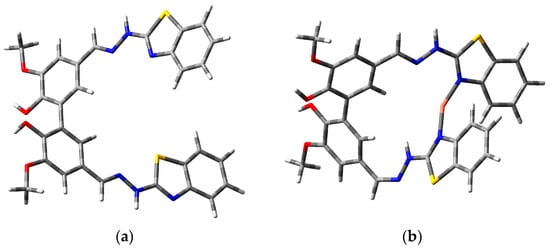 It was found that Cu2+ was coordinated with both -N sites of benzothiazoles, as shown in Figure 1b, forming two coordinate bonds. The Cu2+-N bond length values were 1.93 Å and 1.92 Å for each -N. The total energy of the optimized structures of L and L-Cu2+ were −2582.60 and −4222.71 Hartrees, respectively. The optimization energy values suggest that the total energy of the complex was lower compared to L, indicating higher stability of the L-Cu2+ complex.