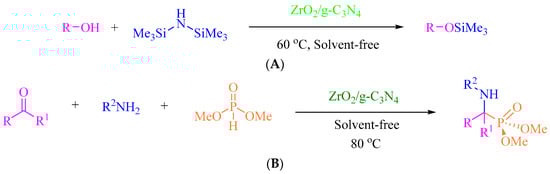 Protection of alcohols with hexamethyldisilazane (HMDS) catalyzed by ZrO2/g-C3N4 (A), and synthesis of α-aminophosphonates by ZrO2/g-C3N4 (B).