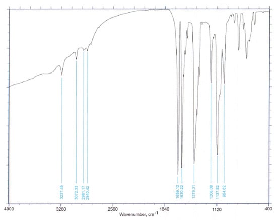 The IR spectrum for 1 also confirms the methanolysis reaction of the 2-cyanopyridine to give the O-methyl picolinimidate ligand. Thus, the spectrum (Figure 2) has a sharp band with a medium intensity at 3237 cm−1, characteristic of the N–H vibration of O-methyl picolinimidate []. The C–H stretching vibrations of the methyl groups of the carboxamide appear at 2981 and 2940 cm−1, while the absence of the ν(C≡N) band (which should have appeared at about 2240 cm−1) is indicative that the nitrile group has been converted to a carboxamide one. An additional strong band at 1659 cm−1 is also assigned to ν(C=NH) of the carboxamide group. The C–H stretching vibrations of the pyridine rings appear at 3072 cm−1. Different medium and strong bands observed in the range 1631–1591 cm−1 are assigned to C=N, C=C, and C–C stretching vibrations. The absorption band at 1379 cm−1 is assigned to the ν(=C–O–) stretching vibration which mixes with δ(NH) of the imino ether group. The νas(C–O–C) and νs(C–O–C) absorption bands appear at 1138 and 965 cm−1, respectively. The absorption band observed at 1206 cm−1 is assigned to δ(O–CH3).
