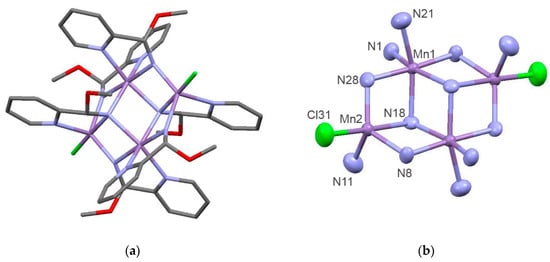 The reaction of 2-cyanopyridine and Mn(II) in methanol solution leads to the formation of 1 containing O-methyl picolinimidate as the chelate ligand. The methanolysis of the initial 2-cyanopyridine takes place upon coordination with the Mn(II) ion as a chelating bidentate ligand through the two nitrogen atoms of the pyridine ring and the carbonitrile group. As observed previously, the coordination of 2-cyanopyridine to some divalent metal ions activates the CN triple bond and makes it much more amenable toward nucleophilic attack by CH3OH molecules [,]. The proposed stoichiometry for complex 1, Mn4L26Cl2, in which six O-methyl picolinimidate ligands are in a monoanionic mode (L2)−, was confirmed by analytical and spectroscopic data. Moreover, recrystallization from the mother liquors afforded X-ray quality crystals for 1.