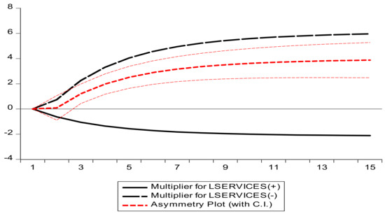 where ln denotes the log values of GVA for agriculture (), construction (), industry (), and services (), while and are the total increases and decreases in the log GVA up to time t. To check for statistically significant differences between and , the Wald test is applied and the results reject the hypothesis of long-term symmetry. This becomes apparent at the dynamic multipliers graph (Figure 1).