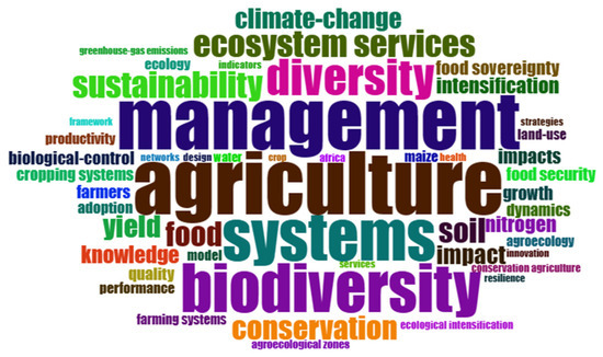 In Figure 2, the most frequently used terms emphasize the significance of the terms and keywords used in publications related to agroecological practices. The terms most abundantly used include management, agriculture, systems, and biodiversity as the focal heart of agroecology. Ecosystem services, diversity, sustainability, conservation, food, and soil impact are the second most important cluster of terms. The combination of these terms reflects how agroecology covers different dimensions, not only environment and agriculture. Akakpo et al. (2021) [4] have highlighted that agroecology is a necessary agricultural model that is capable of mitigating the effects of climate change, conserving biodiversity, securing sustainable food production, and preserving local ecosystems while valorizing them.