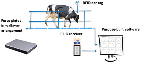 The system prototype is simplistically presented in Figure 3 and generally consists of the following described basic parts, which are force plates in a walkway arrangement, an RFID ear tag system with a receiver and tags in all cattle ears, and a PC running purpose-built software that includes a user interface and a machine learning algorithm that supports the decision-making process.