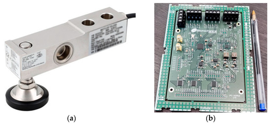 Electronic components of the system. (a) Shear beam load cell. (b) Custom-designed and -built PCBs for project needs.