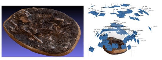 Photogrammetry was the chosen technology to acquire and create a 3D model, capturing the details of the shape, texture and material of the archaeological soil block. We used an APS-C camera equipped with a 20 mm lens, the Canon 60D. Small apertures (f8–f16) were selected to ensure optimal focus, particularly in critical scenarios where the camera was close to the object. The distance between the camera and the object varied (0.53m) based on the object’s placement. To capture the images effectively, a minimum of 70% overlap was maintained between the adjacent images. Manual focus was employed for zoomed areas of the object in critical conditions to prevent undesired blurring due to unmanageable autofocus errors. The ISO level was adjusted appropriately for small apertures and normal illumination conditions.