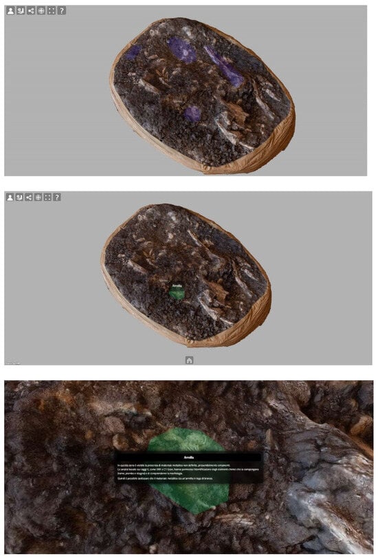 ATON is a framework developed by CNR ISPC to create Web3D/WebXR apps interacting with cultural objects and 3D scenes on the Web []. It offers a powerful application programming interface (API) to manipulate scene graphs, customize event handling for rich interactions and much more, alongside a scalable rendering system with responsive interfaces. It encompasses cutting-edge features such as the advanced rendering of 3D objects using physically based rendering (PBR) and virtual environments, the management of viewpoints (POV), spatial user interfaces for extended reality (XR) sessions, real-time collaborative capabilities, visual and immersive analytics, and integration with complex multimedia content. These digital assets also serve as potent instruments for interactively conveying their significance to non-specialist people, simplifying the comprehension of complex or unclear ideas. VR and AR are effective tools for interacting with 3D models, making it easier for people to understand and appreciate cultural artefacts. These technologies can play an important role in education, providing visitors with the ability to explore different spaces and periods. They enable the presentation of information and concepts that might otherwise be intricate in an accessible and appealing manner []. By employing this framework, it became feasible to transform the 3D model generated through photogrammetry into a navigable structure, making it entirely explorable and supplementing it with annotations about the different elements integrated into the landscape. It also accentuated objects that might not be readily apparent (Figure 2) [].