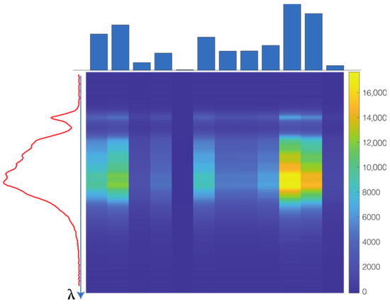Each sample was characterized by the reflectance spectra and the sensor’s response pattern. The data from both instruments were combined, calculating the outer product of the spectra with the sensor’s pattern. The outer product returns, for each sample, a matrix with the dimensions 256 × 12 (see Figure 1).