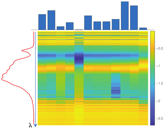 A p-value map of the outer product of the spectral and electronic nose signals. Representative spectra are shown. The values of the color bar are in a logarithmic scale.