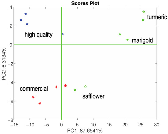 An ANOVA was carried out on each element of the matrix in order to determine the matrix elements that better identify high-quality saffron with respect to the other samples. Figure 2 shows a map of the p-value. Interestingly, the wavelengths contributing to the matrix element with the lowest p-value do not correspond to the spectral peaks. Rather, the spectral region between the two major spectral features mostly contributes to the identification of high-quality product. With respect to the contribution of the sensors of the array, the sensor with the greatest contribution is the device characterized by the smallest signal. Figure 3 shows a score plot calculated using the matrix elements with a p-value of less than 0.01. Before the PCA, each matrix was unfolded in a vector.