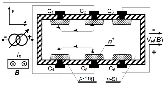 In Figure 1, the top view of the new Hall microdevice is shown. On the long sides of the thin n-Si substrate, two groups of three heavily doped n+ ohmic contacts, namely C1, C2, and C3 and C4, C5, and C6, respectively, are formed symmetrically and opposite to each other. The first two opposite electrodes are connected and the second two are fed in the same way; the third ones are the output. A deep surrounding p-ring is also present, which reduces the spreading of surface currents and confines the transducer region in the substrate. Contacts C3 and C6 of the sensor are those which are moved out of the areas where supply currents IC1,2 and IC4,5 flow. Field B is perpendicular to the plane, and electrodes C3 and C6 constitute the differential output VHC3,C6(B) ≡ VH(B). The operation is as follows. The supply contacts C1, C2, C4, and C5 are equipotential surfaces. As a result, the current lines IC1,2 and IC4,5 are initially perpendicular to them and penetrate deeply into the x-y area of the substrate. The field B leads to the Lorentz lateral deflection of the current paths in the x-y plane. They generate opposite-sign charges in the zones with contacts C3 and C6, i.e., VH(B). The specific two single Hall devices share the same active region. The elements with contacts C1, C2, and C3 and C4, C5, and C6, respectively, are controlled by the components IC2 and IC5. The increased sensitivity of the device results from the drastically reduced parasitic surface currents from the location of contacts C1 and C2 and C4 and C5 on the various long sides.