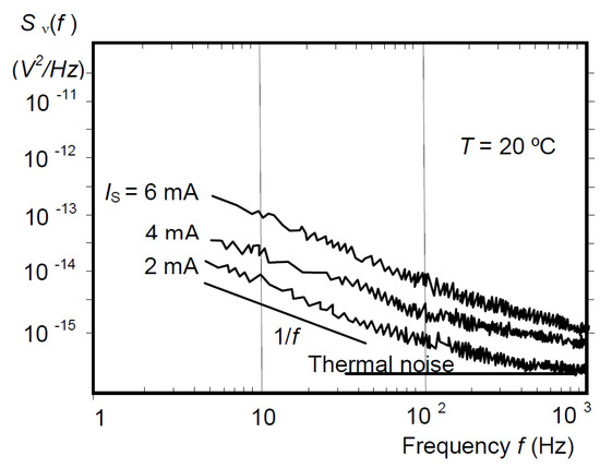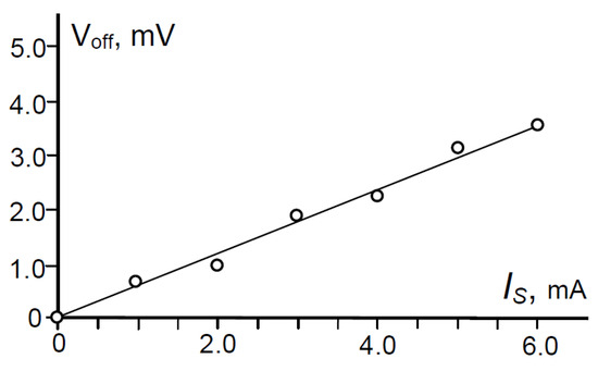 The sensitivity is SRI ≈ 40 V/AT. The nonlinearity constitutes no more than NL ≤ 0.2% in field B ≤ ±0.3 T and NL ≤ 0.6% in ±0.3 T ≤ B ≤ ± 0.7 T. According to the obtained data, the sensitivity temperature coefficient TCs is 0.1%/°C. It was established that the temperature coefficient of resistance R within the range 0 °C ≤ T ≤ 80 °C is approximately TCR ≈ 1.1%/°C. The initial offset of the new configuration is by about 25% lower than structures similar to the 3C microdevices. The offset voltage is a linear function of the current Is, Figure 2. The noise behaviour of the device is shown in Figure 3. At low frequencies, the spectrum f ≤ 1.0 kHz is typical for usual Hall plates, i.e., 1/f type. The extracted resolution in terms of the equivalent induction Bmin = [Sn,v(f)Δf2]/SA, [T] at current Is = 4 mA over bandwidth Δf = 5 Hz–400 Hz at the signal-to-noise-ratio S/N = 1 is around Bmin ≈ 16 µT.