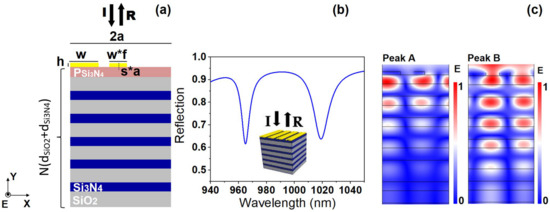 The structure is composed of a nanostructured grating constituted of two different nanoribbons per period 2*a deposited on a DBR of (SiO2/Si3N4)6, as shown in Figure 1a.