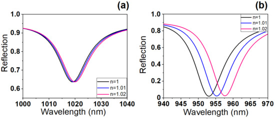 From the reflection spectra of the Tamm structure without a porous layer (Figure 2a), we calculate the sensitivity to detect an index change of 1%, S = 40 nm/RIU. The use of a porous nitride layer allows us to increase the sensitivity of the structure 5 times, S = 200 nm/RIU.
