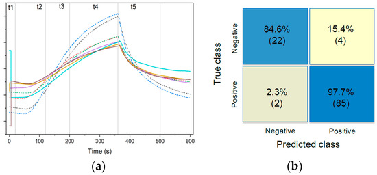 (a) Sensor signal of one out of 32 sensors after preprocessing for four cancer samples (dashed) and four negative controls (solid); (b) confusion matrix showing true class vs. predicted class for 113 samples (87 cancers and 26 negative controls).