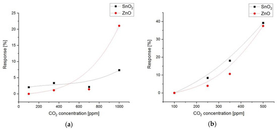 Response curves of the SnO2 and ZnO sensors to different CO2 concentrations at room temperature: (a) response curves in dry air (without humidity); (b) response curves in wet air (with 50% humidity).