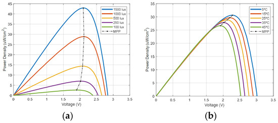 Experimental results for an amorphous PV cell (Panasonic AM1454, with an active area of around 11 cm2) subjected to cold white LED at (a) different levels of illuminance with a constant temperature (25 °C), and (b) different temperatures with a constant illuminance (1000 lux).