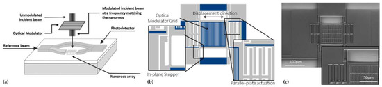Several silicon-based photonic detectors have been proposed but are unsuitable for wavelengths larger than 1 µm. A silicon mechanical-photonic wavelength converter (MPWC) was proposed [1] for an all-silicon infrared detector, not based on absorption, consisting of a Mach–Zehnder interferometer (Figure 1) in which the incident input light is modulated at a temporal frequency matched to the mechanic resonance of nanorods in the reference beam waveguide, and relying on the resonance of the nanorods due to optical gradient force. The challenge is to fabricate MEMS shutters/actuators with high-enough operation frequencies (and enough displacement amplitude) and silicon nanorod arrays with matching resonant frequencies, resulting in a 1–2 MHz feasible range. High-frequency MEMS resonators exist but with displacements limited to the picometer range [2,3].
