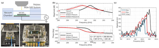 (a) Experimental setup, (b) bode plots at different pressures, and (c) magnitude displacement in low-pressure conditions for different amplitude actuation signals.
