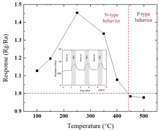 The resistance behavior under air and NO2 at 250 ppb was investigated at different temperatures in isothermal mode. As the NO2 is an oxidizing gas, the resistance increased, meaning that the material is an n-type semiconductor. The ratio was calculated at each temperature and is represented in Figure 3. The best response was obtained at 250 °C and decreased above that temperature (Figure 3). Furthermore, above 450 °C the response was reversed; the copper ferrospinel film behaved like a p-type semiconductor. Gas-sensing performances seem to depend on structural properties, since the structural transition starts at 350 °C.