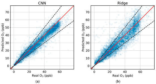 Predicted vs. real concentrations of ozone for (a) the CNN model and (b) the ridge regression.