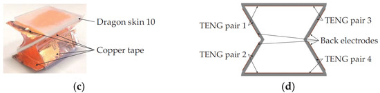 Figure 1c illustrates the conceptual design of the unit cell of H-TENG. The unit cell is very similar to the X-shaped TENG proposed in 2018 [3], but their material selection, fabrication procedure, and application are entirely different. H-TENG is fabricated using Dragon skin 10(DS-10) silicon elastomer and copper tape. DS-10 functions as the negative triboelectric layer, while Cu tape serves as the positive triboelectric layer and the back electrodes for the negative layer. Each cell consists of four copper–silicone TENGs located at the four corners of the unit cell, indicated in Figure 1d.