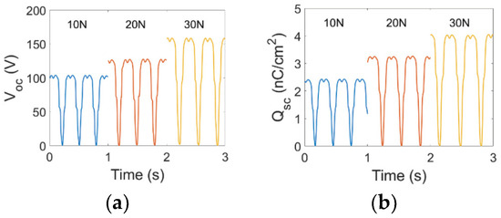 Figure 2. The unit cell (a) open-circuit voltage and (b) charge density under different excitation forces.
