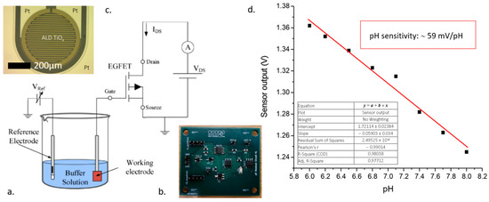 Schematic measurement setup representing the electronic architecture of EGFET-based pH sensor (a), the manufactured read-out electronics (b), and the MOx-functionalized working electrode (c). The pH sensitivity of the non-stoichiometric TiOx layer was close to the Nernstian response (d).