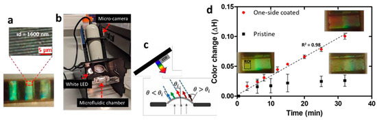 Figure 1a). A transparent polymethyl methacrylate (PMMA) microfluidic system (v = 160 μL) was fabricated by laser cutting, allowing for the fluid management and simultaneous color imaging of the sensors. The light diffracted by the sensors surface was measured in a Littrow configuration using a home-made black PMMA structure integrating a collimated white light source, a beam-splitter and a USB microscope (Dino-Lite, (New Taipei City, Taiwan) (