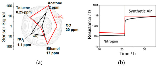 The WO3-based samples with the Au additive showed higher sensor signals for all of the tested reducing gases, see Figure 1a. This stands in stark contrast to the results attained with other oxidized noble metal additives, where the sensor signal for all the test gases, except ethanol, became negligible at 5 wt% loading [1,2,3,4]. Additionally, unlike other noble metal additives that cause a significant increase in the sensor’s resistance to nitrogen, the values for the sensor with Au additives were similar to those of the pristine sample, see Figure 1b.