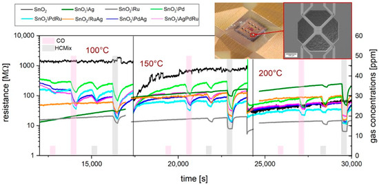 A typical resistance measurement for bare and Ag, Ru, Pd, PdRu, RuAg, PdAg, and AgPdRu NP-functionalized sensors toward CO and HCMix gas pulses (concentration: 5 ppm, 50 ppm) is shown in Figure 1 for 100 °C, 200 °C, and 300 °C operation temperatures. While the bare sensors show no response (=resistance decrease) at all to CO and HCMix levels, the NP-functionalized sensors show significantly increased response already at these comparatively low operation temperatures. Moreover, the sensors functionalized with different metallic NPs react differently to the gases, which enables the adjustment of the sensor’s selectivity to specific target gases. This is our strategy toward the development of a multi-gas sensor device: by properly functionalizing the sensors with different NPs, the sensor array (see inset) is capable for the simultaneous sensing of several target gases.