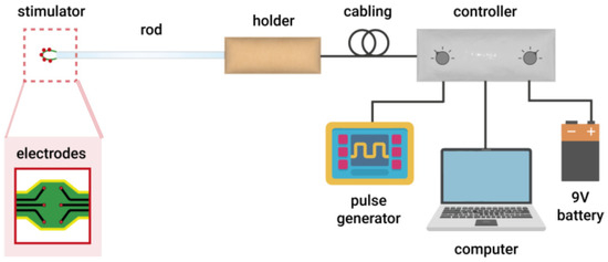 Scheme representing the setup for electrical stimulation of the nose: the stimulator comprises electrodes and is connected via a cable to a microcontroller and a pulse generator. The computer sends the stimulation parameters to the controller, which is powered by a 9V battery.