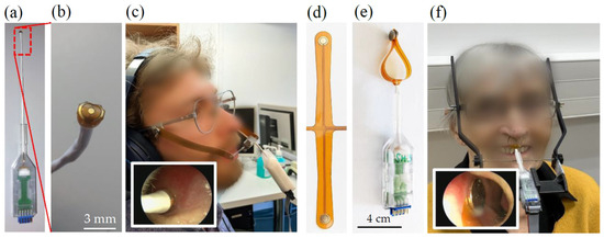 Electrical stimulation of the nasal cavity has already been shown to provide different types of sensations [3]. Electrodes were thus employed using commercial flexible PCB technology, and we explored two designs for the placement of electrodes against the nasal mucosa. Figure 1 gives a schematic illustration of the set-up which allows us to perform stimulations with computer-controlled parameters. The first design (rod configuration) consists of a metallic rod with electrodes placed at its tip. The rod is inserted in one nostril and contact is ensured using the mechanical bending of the rod in conjunction with an external frame as shown in Figure 2a–c. In the second design (magnetic clip configuration), the PCB comprises two branches with electrodes and magnets at their extremity. Each branch is inserted in one nostril and the magnetic force maintains the electrodes in contact with the mucosa across the nasal septum as shown in Figure 2d–f.