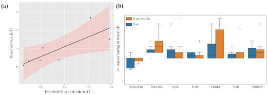 Perceptual ratings. (a) Comparison of threshold for electrical stimulation with best fit linear regression and standard error. (b) Comparison of perceptual ratings for seven normosmic participants to electrical stimulation at threshold at the anterior septum using the magnetic clip versus rod designs.